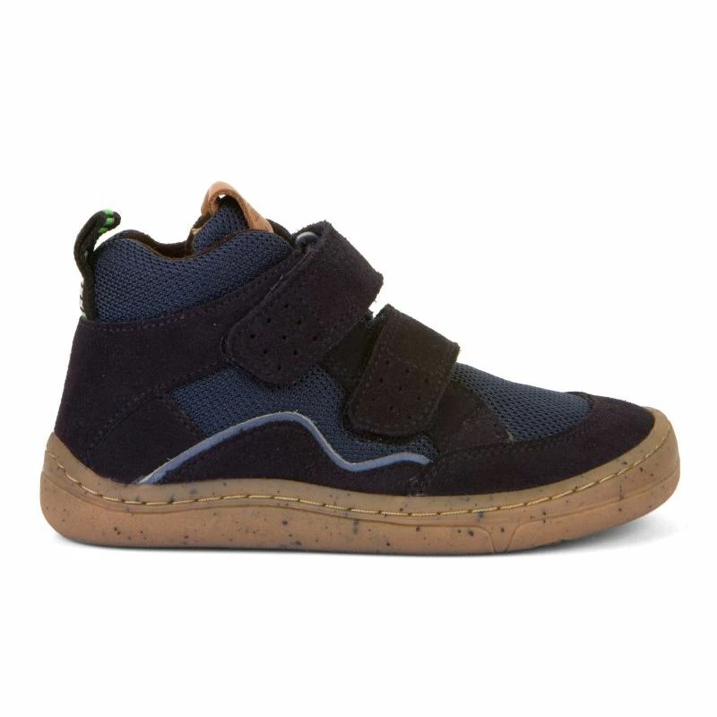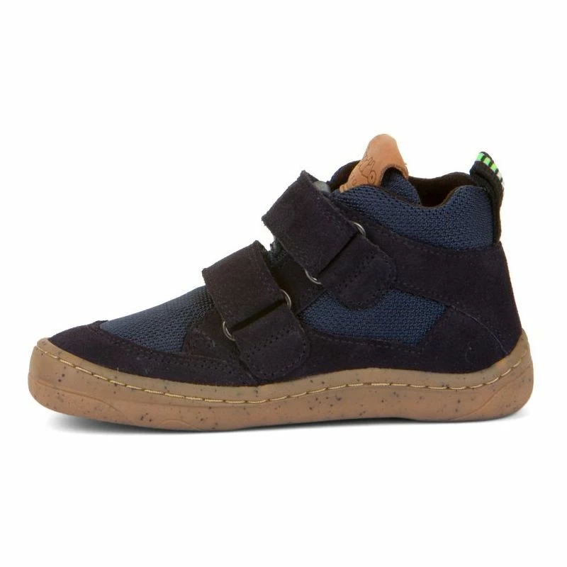 A practical double velcro high top ankle boot from the Froddo Barefoot range. This boot has a leather and synthetic mesh water repellent upper with a soft and cosy textile lining and a thermal insole for extra warmth. It is on the original barefoot sole from Froddo which is zero-drop, 4mm thin and flexible with a great wide toe box.