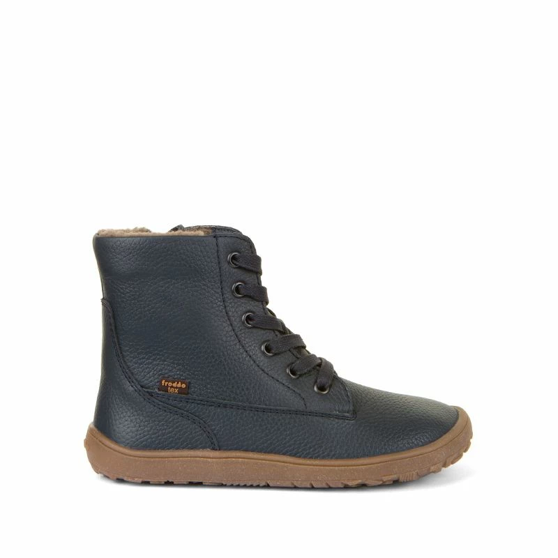 This waterproof boot is a stylish addition to the barefoot range from Froddo. Made with a smooth leather upper, warm wool lining and a waterproof membrane this is a great every day option in bigger sizes and suitable for older kids and juniors. It is on the Froddo ‘Extra Grip’ barefoot sole unit. This sole is designed for more grip than the standard barefoot sole but is the same shape and width. The sole is 5mm thick with a 1mm lug. It is zero-drop, thin and flexible with the nice wide toe box we have come to expect from the Froddo Barefoot range