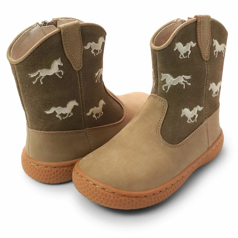 A classic boot from Livie and Luca on the Honeycomb Sole. It is a lovely new design in leather and suede with pony motif embroidery. It features an internal side zip for easy on and off and a breathable leather lining and insole. The Honeycomb sole has a unique honeycomb pattern and stitching around the edge. It is made from Stroebel construction, a method that increases the flexibility of the whole shoe. It is not as wide or as flexible as the other Livie and Luca soles but has good durability with the sole coming up around the shoe for extra protection. Perfect for a confident walker.