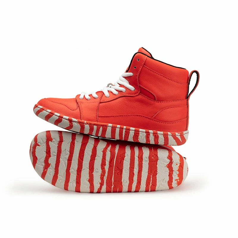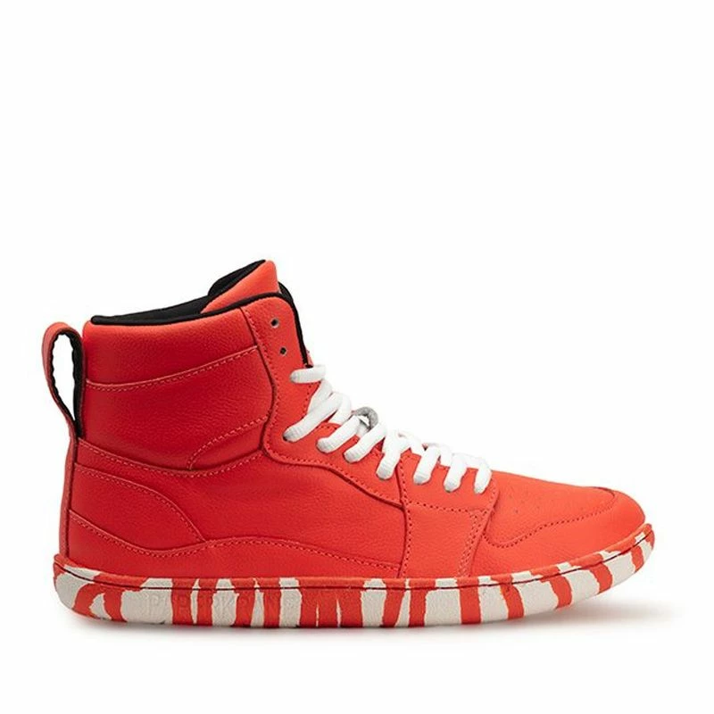 Fun and quirky high top boots from Australian brand, PaperKrane. These shoes have a zero drop 4mm thin sole made of flexible natural rubber. They have a soft red leather upper in a unique and eye catching design. The lining is a black sports knit. They have a lace up design with round red laces. The durable sole is stitched to increase lifetime.