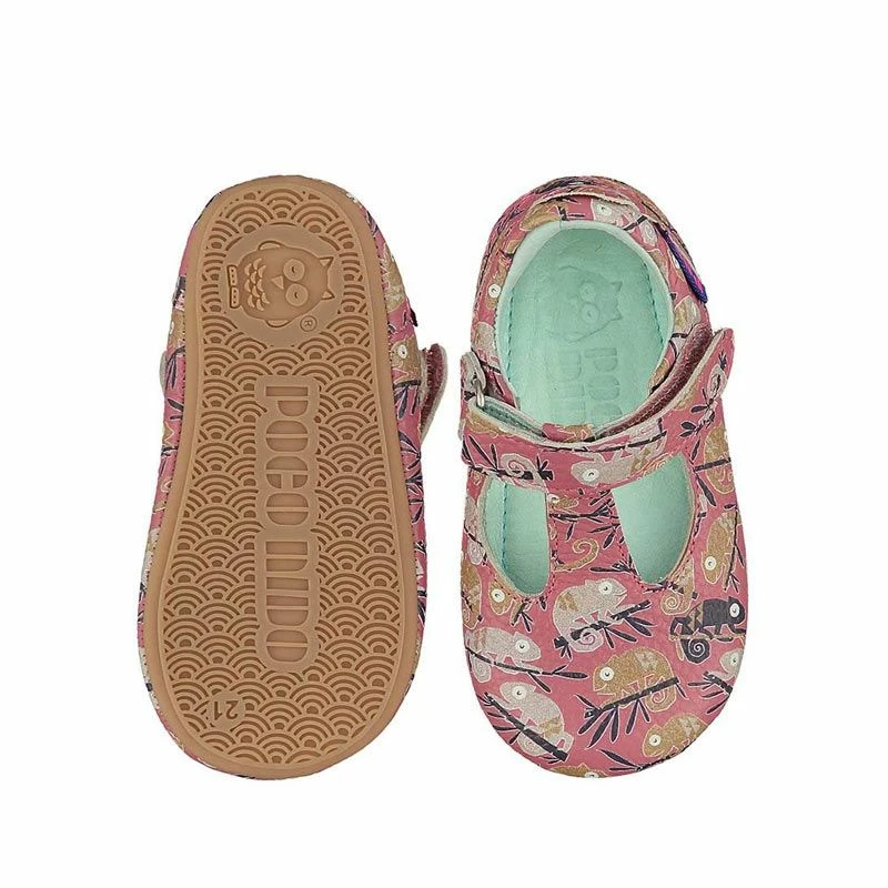 The Mighty Shoes from Poco Nido are a lovely range of rubber soled leather shoes. They are designed with barefoot principles to be beautifully foot shaped, with a thin and flexible TPU rubber sole suitable for outdoor adventures. They are made from a super soft leather in a range of beautiful colours and prints. This T-Bar version has a velcro closure and works well for higher insteps with a great adjustment to fit a range of widths.