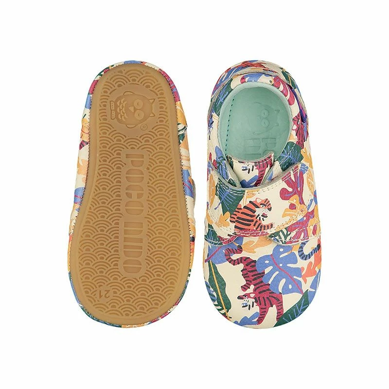 The Mighty Shoes from Poco Nido are a lovely range of rubber soled leather shoes. They are designed with barefoot principles to be beautifully foot shaped, with a thin and flexible TPU rubber sole suitable for outdoor adventures. They are made from a super soft leather in a range of beautiful colours and prints. The velcro closure gives a great adjustment to fit a range of widths.