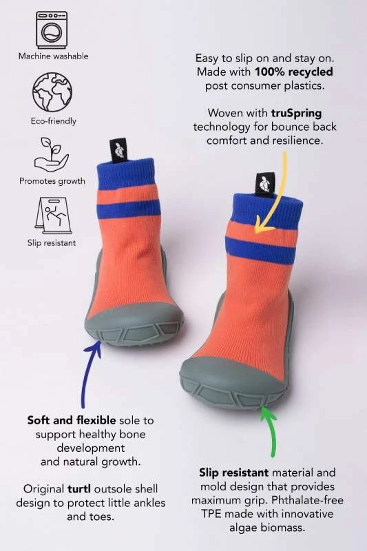 Turtl socks in a shell are an innovative indoor/outdoor sock shoe. They are eco-friendly and lightweight with a slip-on sock upper that is made from 100% recycled post consumer plastics. The stretchy knit is lovely and soft and has a ribbed cuff around the ankle to ensure a comfortable but secure fit. The slip-resistant protective shell sole unit is zero drop, 4mm thick and a great wide fit allowing for lots of space in the toe box. It is also recyclable and made from eco-friendly Bloom algae rather than plastic.