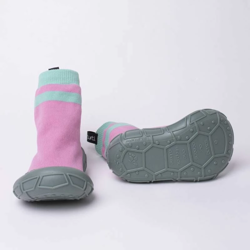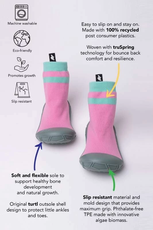 Turtl socks in a shell are an innovative indoor/outdoor sock shoe. They are eco-friendly and lightweight with a slip-on sock upper that is made from 100% recycled post consumer plastics. The stretchy knit is lovely and soft and has a ribbed cuff around the ankle to ensure a comfortable but secure fit. The slip-resistant protective shell sole unit is zero drop, 4mm thick and a great wide fit allowing for lots of space in the toe box. It is also recyclable and made from eco-friendly Bloom algae rather than plastic.